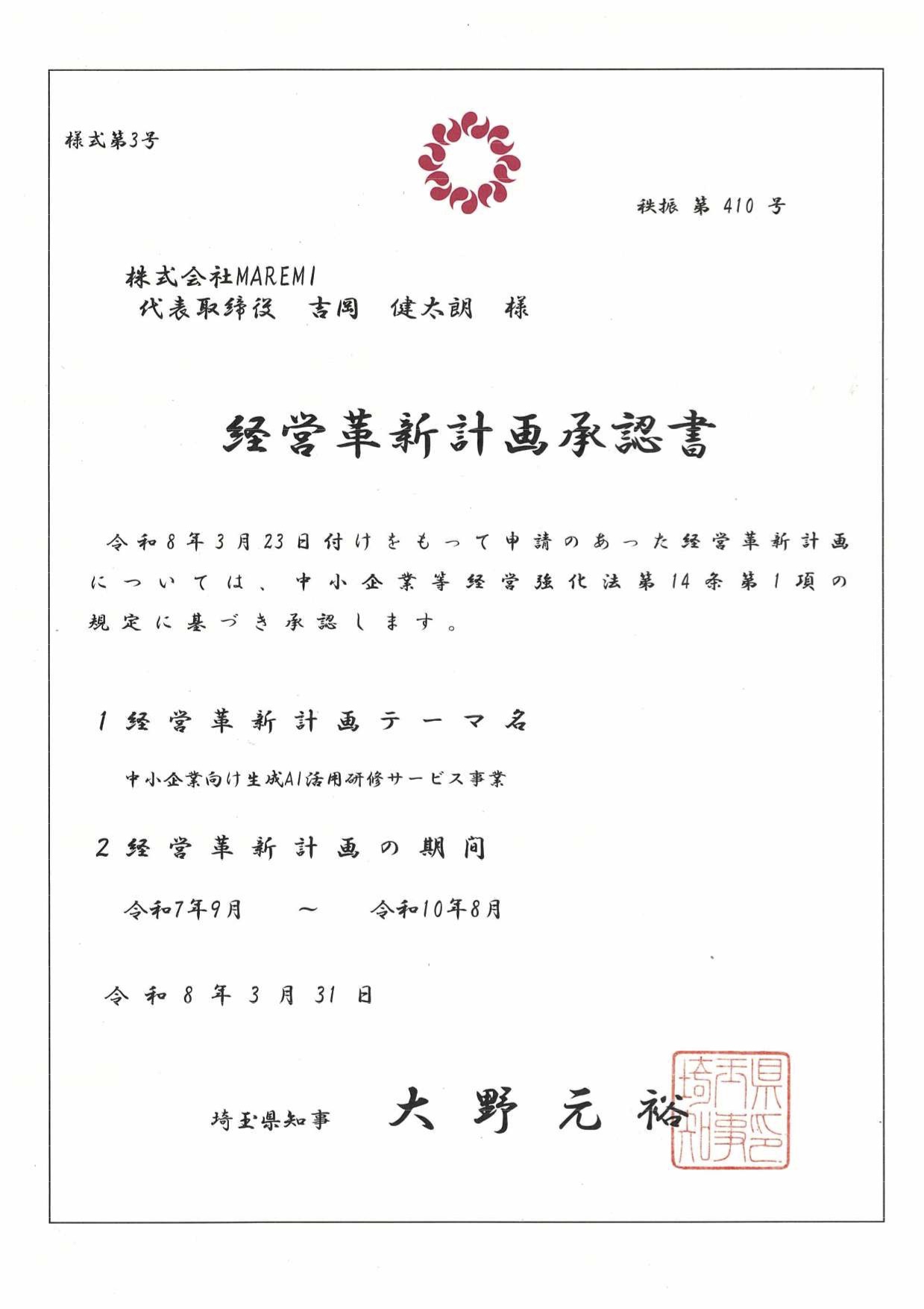 株式会社MAREMI(埼玉県秩父郡皆野町、代表取締役社長:吉岡健太朗)は、2026年3月31日に埼玉県より経営革新計画承認企業に認定されたことをご報告いたします。